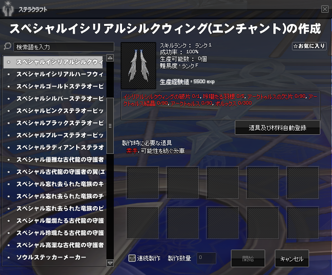 | スペシャルイシリアルシルクウィング(エンチャント) | ・玲瓏たる羽根×5個 ・アークトゥルスの欠片×90個 ・アークトゥルス結晶×90個 ・アークトゥルス×90個 ・ポルックス×300個 ・イシリアルシルクウィングの破片×1個 | |